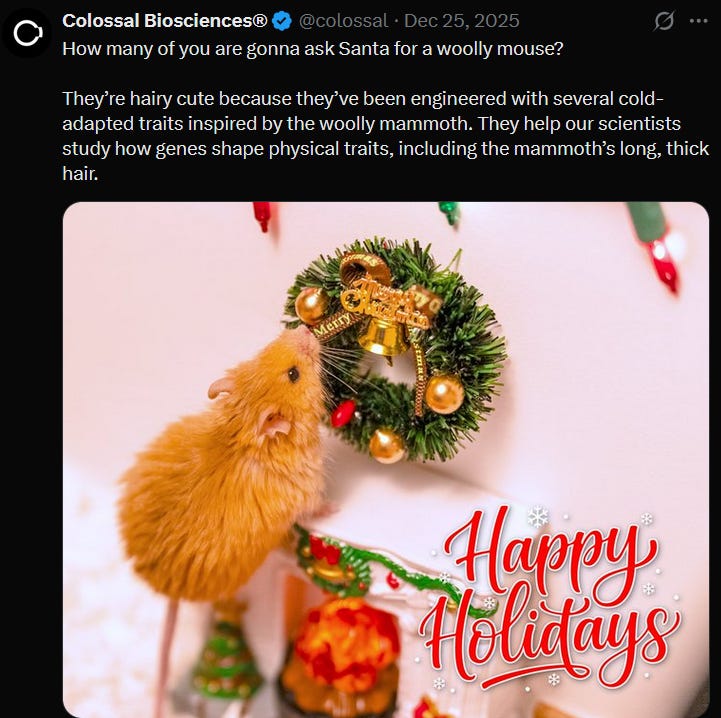 If you thought that Colossal NothingBurgers were going to rest on their laurels and not capitalize on their Joe Rogan Experiences with the one Psy-op, you’d be mistaken. They have run with a Christmas Special for their Social Media splurging out cute, Christmas themed pictures of mice that they claim…. wait for it… that they did their “genetic” mess with a Wolly Mammoth. Did they make it grow a trunk and tusks I hear you ask? Well of course not, remember they can’t make anything that doesn’t already exist in nature. No they claimed they made the first ever Wolly Coated mice.