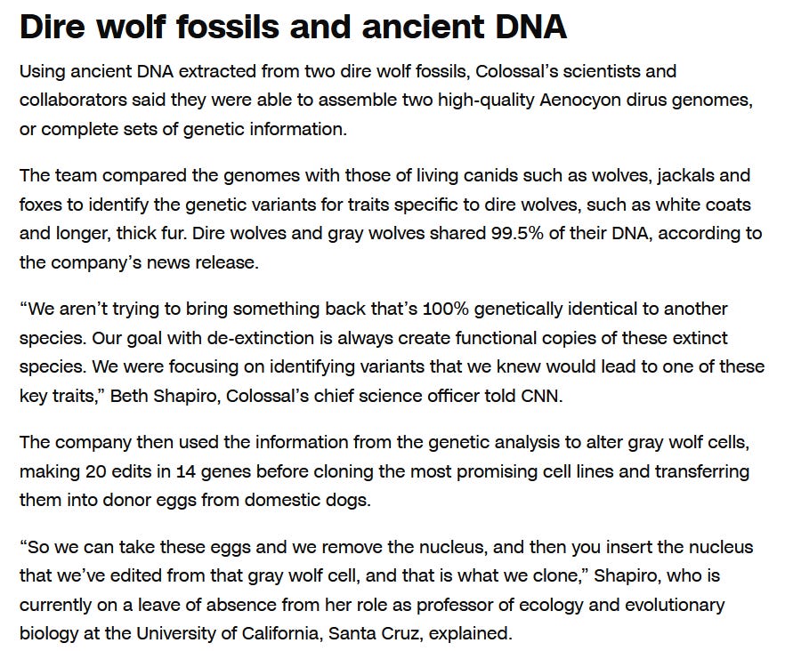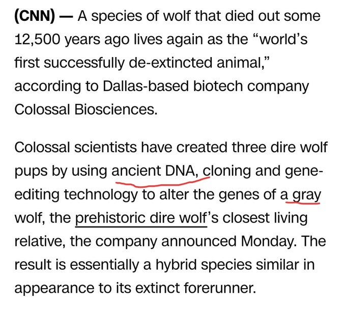 When you combine this with the absolute fucking clanger in the sentence before that “Dire Wolves and Gray Wolves shared 99.5% of their DNA” we should be able to do some pretty quick friggin maths here. They ain’t making it 100% Dire Wolf, they are using Gray Wolves which are 99.5% the same so what they are doing is admitting they are doing quite fuck all.
