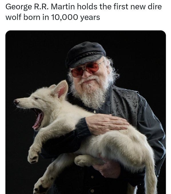 But no, they can’t do that at all. However there are a few claims seeded in opportune places, largely on the TV or Social Media (colour me shocked), where they take things that literally not a single person has ever wanted or needed and have decided to gift humanity with them. This is such a case as with a company by the Name of Colossal Biosciences whom last year convinced themselves that people of Earth needed to make a now claimed extinct wolf called the Dire Wolf reappear. This just so happened to coincide with the Wolf that was made famous on the $10bn grossing worldwide phenomenon of Game Of Thrones.