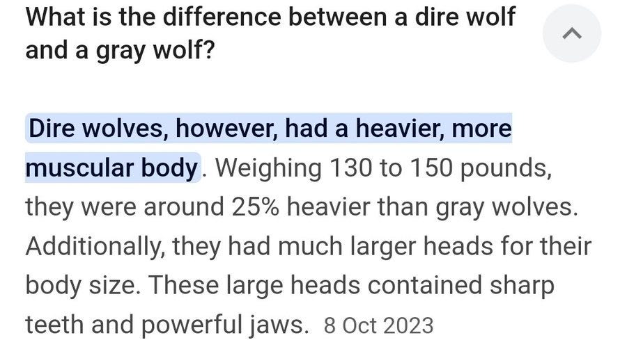 We have seen the quick maths from CSO Beth Shapiro where she admits that they are only even claiming to tamper with about one nostrils worth of the wolf’s non existent “genetics”. So what are they actually claiming is the difference between a Dire Wolf and a Gray Wolf?
