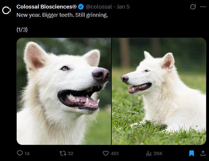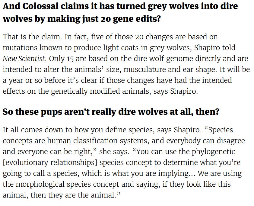 But they weren’t just cashing in on the hype and gathering 350k followers on Twitter and numerous appearances on The Joe Rogan show to spout utter tripe about Genetic Engineering. No, they are your lovable Lab “rewilding” and bringing back from extinction your most cute and cuddly Wolf pups ( Plushie toy available from the gift shop, probably).