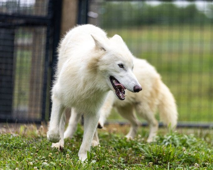 Now comparing the claimed “gene messed” ones with standard Arctic Wolves. Taking examples that are current in age which is around 1 yr old, they share identical features, longer pure white coat, aqualine snout, black gum-line, medium to short length ears, slight mane and completely in proportion head to body ratio. This last and most noticeable feature was one of the only claimed differences in anatomy between the Gray Wolf and Dire, yet it is absolutely clear that these Wolves do not have an enlarged head to body ratio.