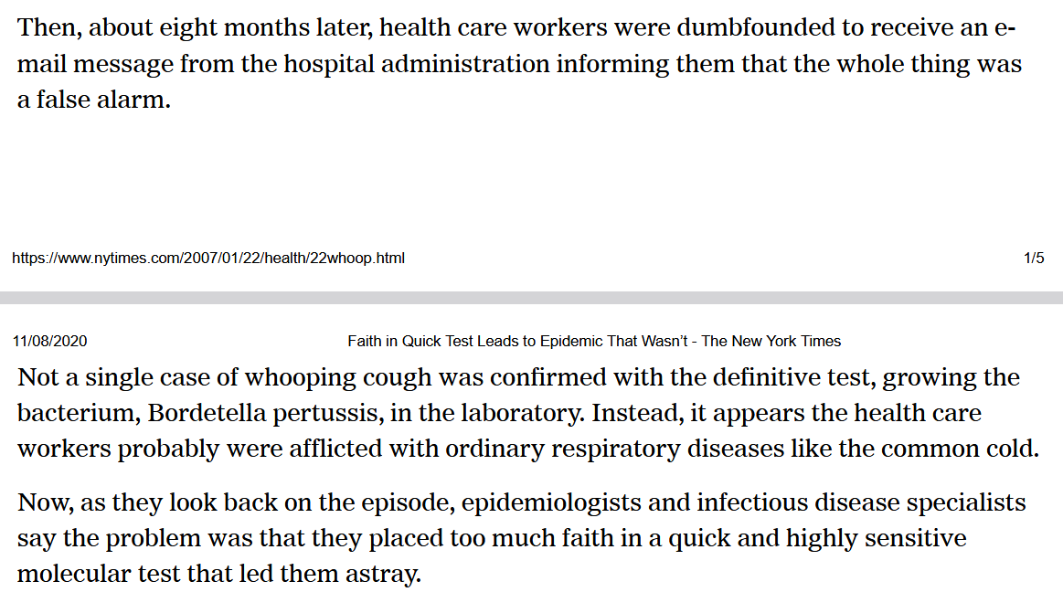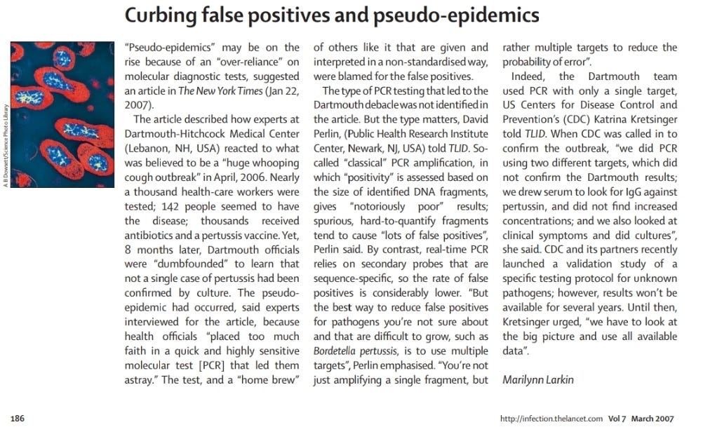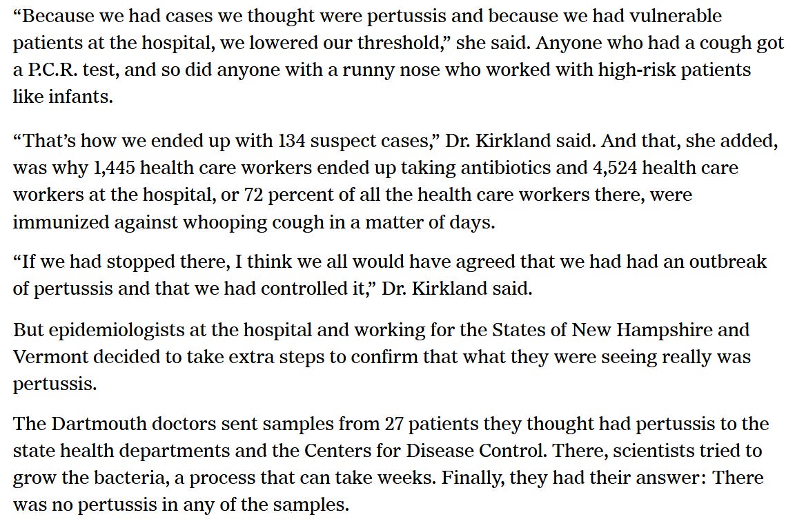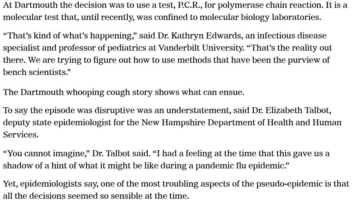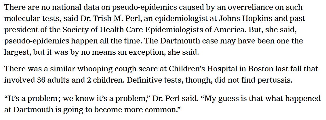 In a stinging reveal by Trish, another Palm-Reader, I mean Epidemiologist at Johns Hopkins, she said “Pseudo-Epidemics happen all the time”. Let me just make this abundantly clear what she is saying: Fake Epidemics caused by fraudulent PCR tests HAPPEN ALL THE TIME. She clarified that this even happened in the same year, just 6 months later with the same disease, Whooping Cough, this time 38 people testing positive for a bacteria that was not present in their body.