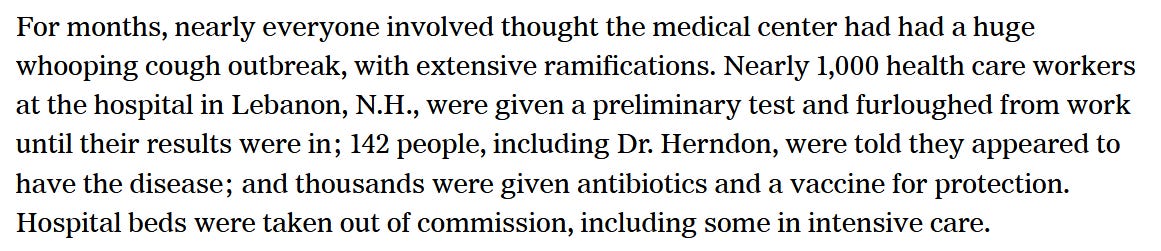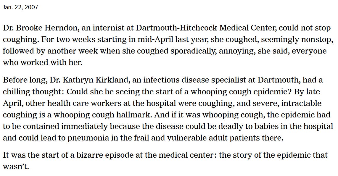 jogged my memory about it and sent me the News Article, which will be the main focus for this article. So thank you to them, Hat tip.In 2006 in a New Hampshire U.S Hospital someone coughed for two weeks. Instead of ignoring this as should have been done, when another couple of people out of the 8000 care workers at the hospital got a cough, the brainlet at the head of Infectious Diseases, Dr. Kirkland sprang into action and immediately started dishing out vaccines and Antibiotics to thousands of those care workers.