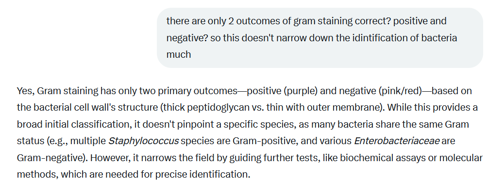 Gram Staining only has two outcomes based on an arbitrary, assumed cell wall thickness with a chemical stain. This doesn’t really narrow down out of the claimed 1800 types of bacteria claimed to be pathogenic. Yet outside of “Bio”Chemical assays of claimed (Non Existent) “Antibodies” and “DNA”, Gram staining is the only differentiator used. Hence I believe that there are probably vastly fewer types of Bacteria out there, they are just being circular reasoned by fake tests to blame for causing diseases.
