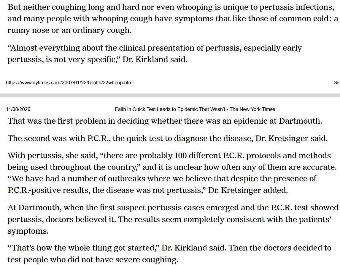 Dr. Kirkland says there are over 100 different PCR protocols with Pertussis alone. Essentially just a palette of reagents that the lab technician can get whatever result they want out of it. Again he mentions that the real problems were on show as soon as they started testing people who didn’t have any symptoms. To simplify this, when doing blinded control experiments, the fraud is quickly revealed.