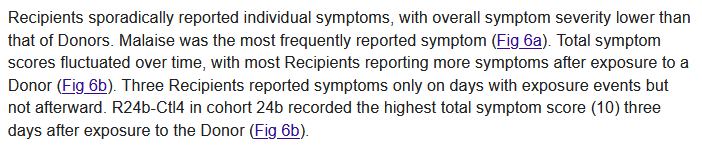 Blink and you might miss this massive egg on face here; “With MOST Recipients reporting MORE symptoms after exposure to a donor”. Let’s break this down real quick. The healthy participants who were merely forced to play Uno with people with Cell Culture squirted oop thine noses, reported MORE symptoms AFTER. This suggests that they also reported symptoms BEFORE the claimed “exposure” event even happened. This is a bit of a dead giveaway that when you give a bunch of Purple Haired, Soyence enthusiasts a multiple choice questionnaire on “How They Feel”, they are going be creative and massively over sensitive with it. I mean we could already guess given, once again the benchmark that they said nobody got sick. But this really should be concrete proof to extend to ALL other trials throughout history where there is some sort of ambiguity.