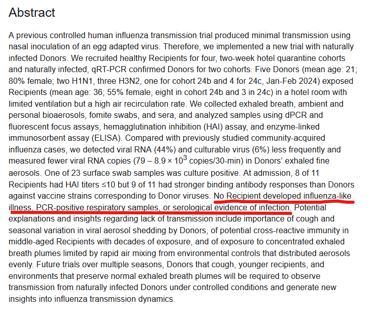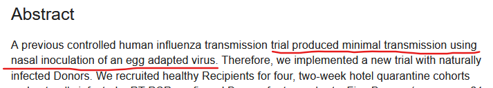 Let’s cut to the chase, it was always going to be difficult to keep this somewhat a mystery with the clue being in the title, but this excerpt in the Abstract shows the absolute devastating conclusion of the results: “NO RECIPIENT DEVELOPED INFLUENZA-LIKE ILLNESS, PCR-POSITIVE RESPIRATORY SAMPLES, OR SEROLOGICAL EVIDENCE OF INFECTION”. In fact this is absolutely identical results to the first “Natural Transmission” paper, the difference being, that they make absolutely no bones about this confirmation that indeed, Contagion of Biological Pathogens in a Hoax.