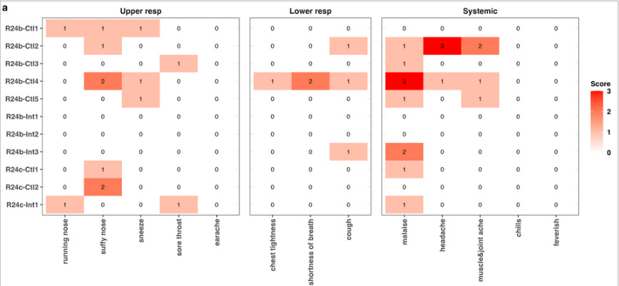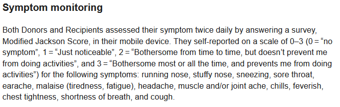 This can be once again clearly demonstrated here. As with all of these, the symptoms were self reported, leaving the obvious total Soyence believers they must be to sign up for a clinical trial, to let their active imagination run wild. When the scoring extremes for these symptoms is not “Hospitalization for the claimed pure pathogen squidged directly up the nasal passages” but indeed “bothersome, most of the time” you can be sure that there were no symptoms of true disease. In fact in the 200 years of contagion studies there has never been a single hospitalization for symptoms of of the probably close to a quarter of a million people experimented on. That really is a fact that cuts through the bullshit of Contagion.
