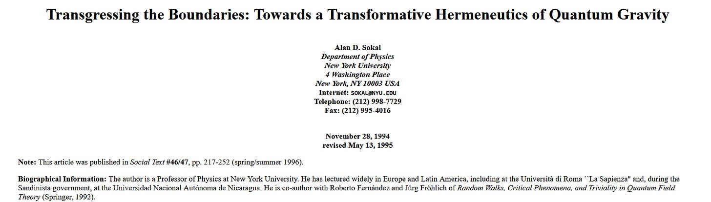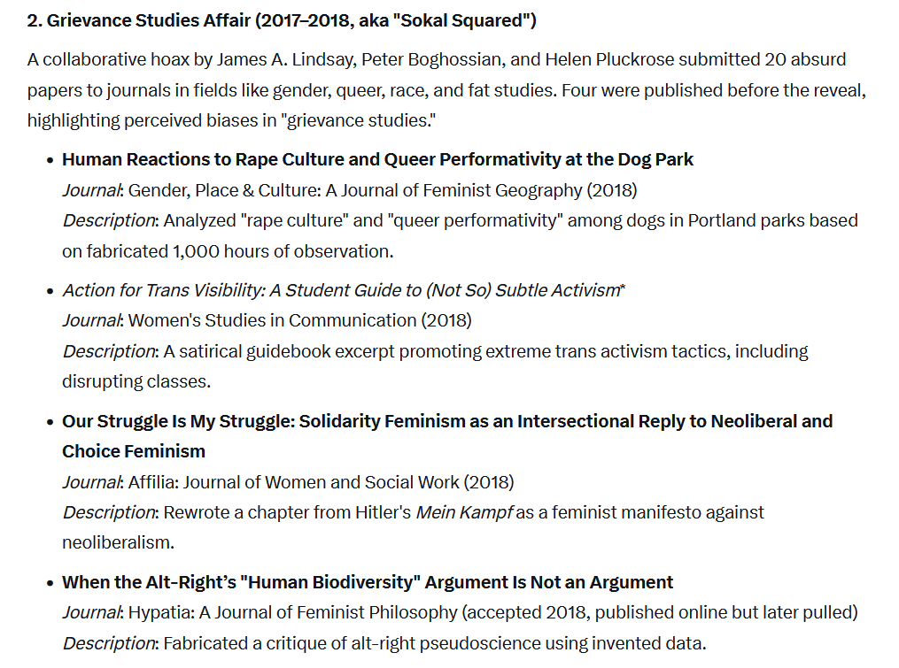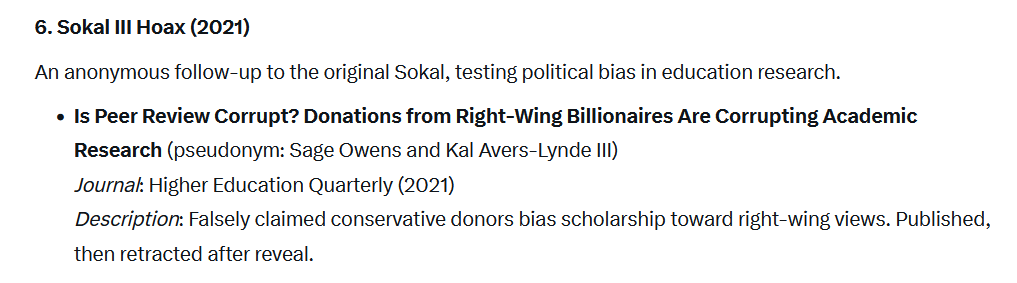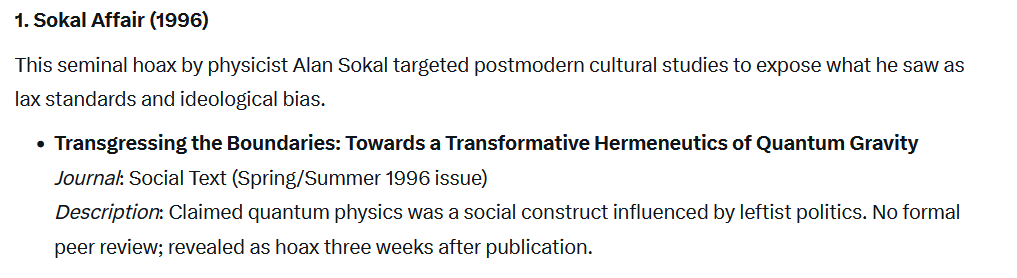 It saw an intentional spoof paper be published claiming Quantum Physics was a social construct influenced by leftist politics. I mean despite being claimed as spoof, this was probably one of the most accurate scientific takes out there, yes most of modern science IS a political construct.