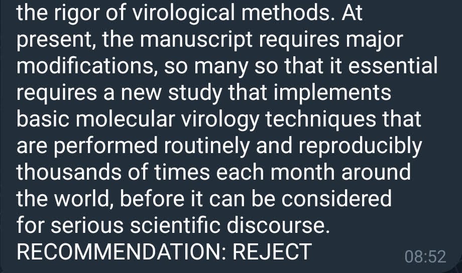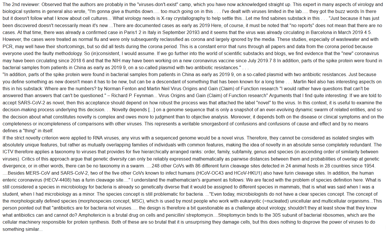 So this pant wettingly funny review is in rebuttal to the paper, which they obviously rejected, where instead of talking about the paper submitted, they completely ignored it and said it is “probably in the No Virus Camp” and then proceeded to list all of the things as to why they think viruses exist. LMFAO!