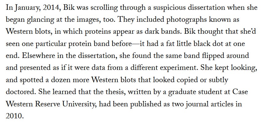 It is no wonder then that when Elisabeth started to notice something strange that published scientists seemed to be doing something quite frequently, which was literally copy and pasting images of these bands from either their own experiments or from completely different ones altogether to pass them off as their own.