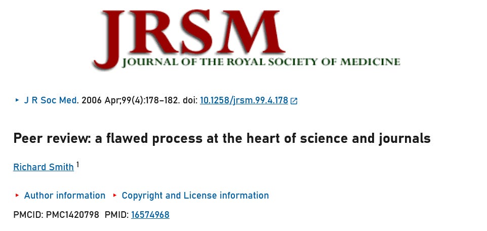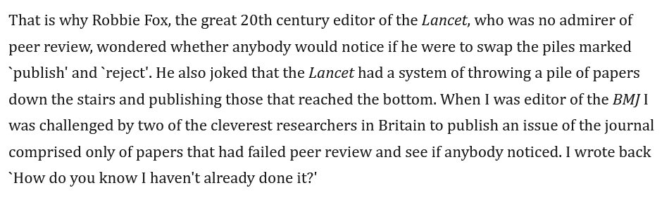In it they quote Robbie Fox, editor of the world wide and highly respected Scientific journal The Lancet. He likened the Peer Review process to standing at the top of a flight of stairs, throwing a bunch of papers down them and publishing the ones that reached the bottom.