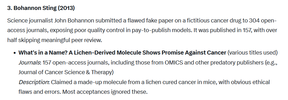This was an interesting one pertinent to our project because it really highlights the nonsense of “Bio”Chemistry. John Bohannon completely made up some molecule he claimed he found in Lichen and sent this paper off to over 300 journals, 157 reputable Scientific Journals Publishing this paper, a fair few not even bothering to put it through review rather, just rush it straight through to publication.