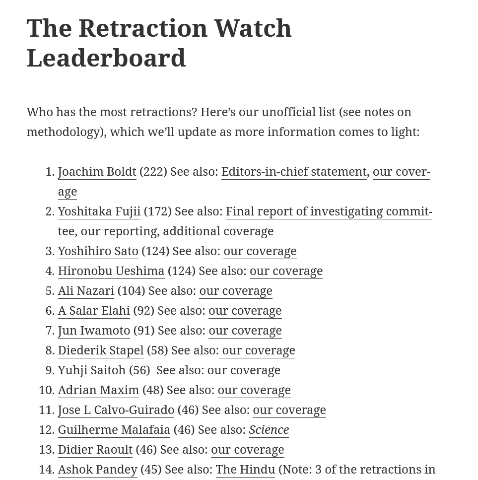 It has a a Leaderboard boasting the biggest frauds and the number of publications they have had retracted, this may actually end up turning into a competition.