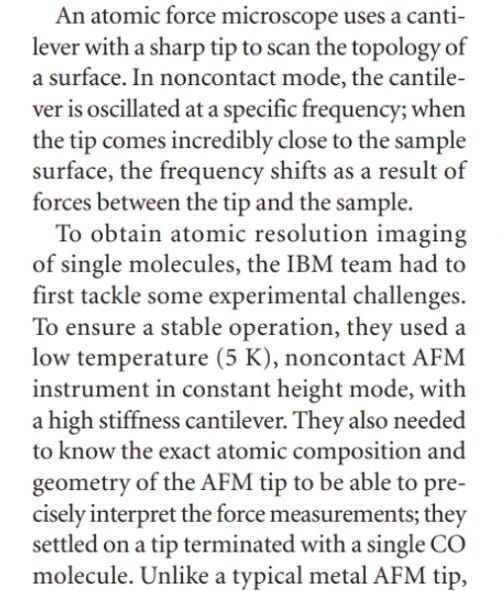 So to see a molecule with AFM first they have to blow a gas at the tip of a needle and then use AFM to show there is no molecule there as it has “jumped” onto the needle. So and I mean call me stupid but why would you need to do anything else if you could see the molecule “jump” onto the needle in the first place then just take a screenshot or something, no?